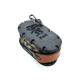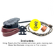 Brown leather, camo-patterned cords with black cord protection and accents. A galaxy black 3D printed Carry Tools (Reel, Little Pan) and a training ball are included with each Sling.