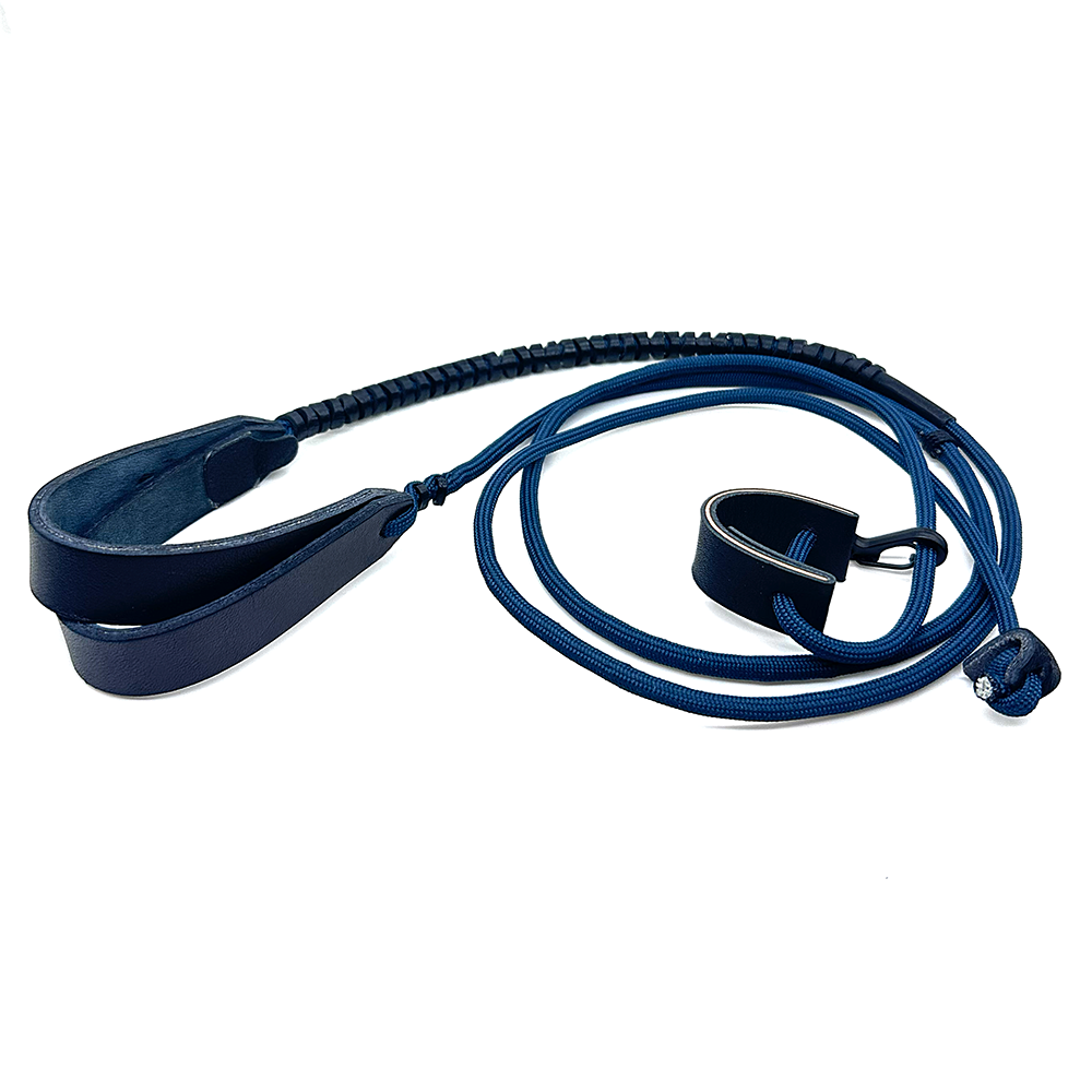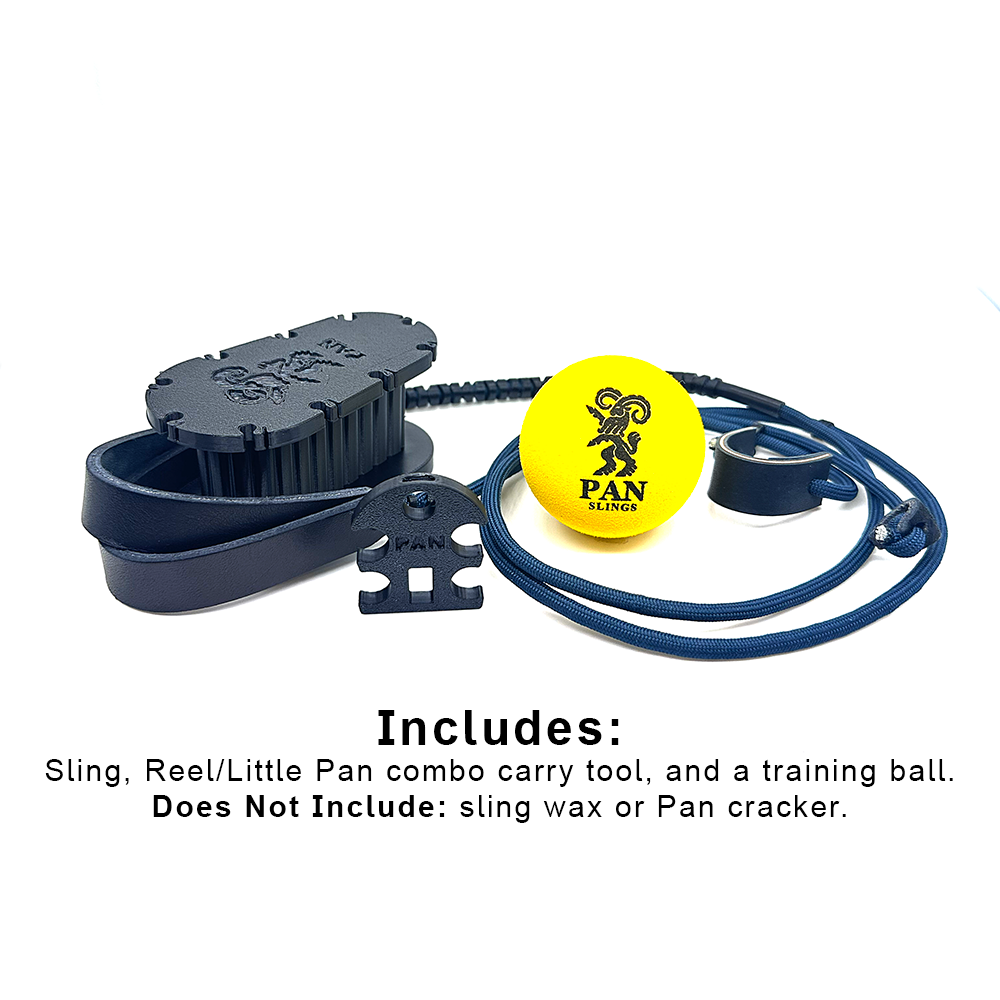 Black leather, space blue cords with black cord protection and accents. A galaxy black 3D printed Carry Tools (Reel, Little Pan) and a training ball are included with each Sling.