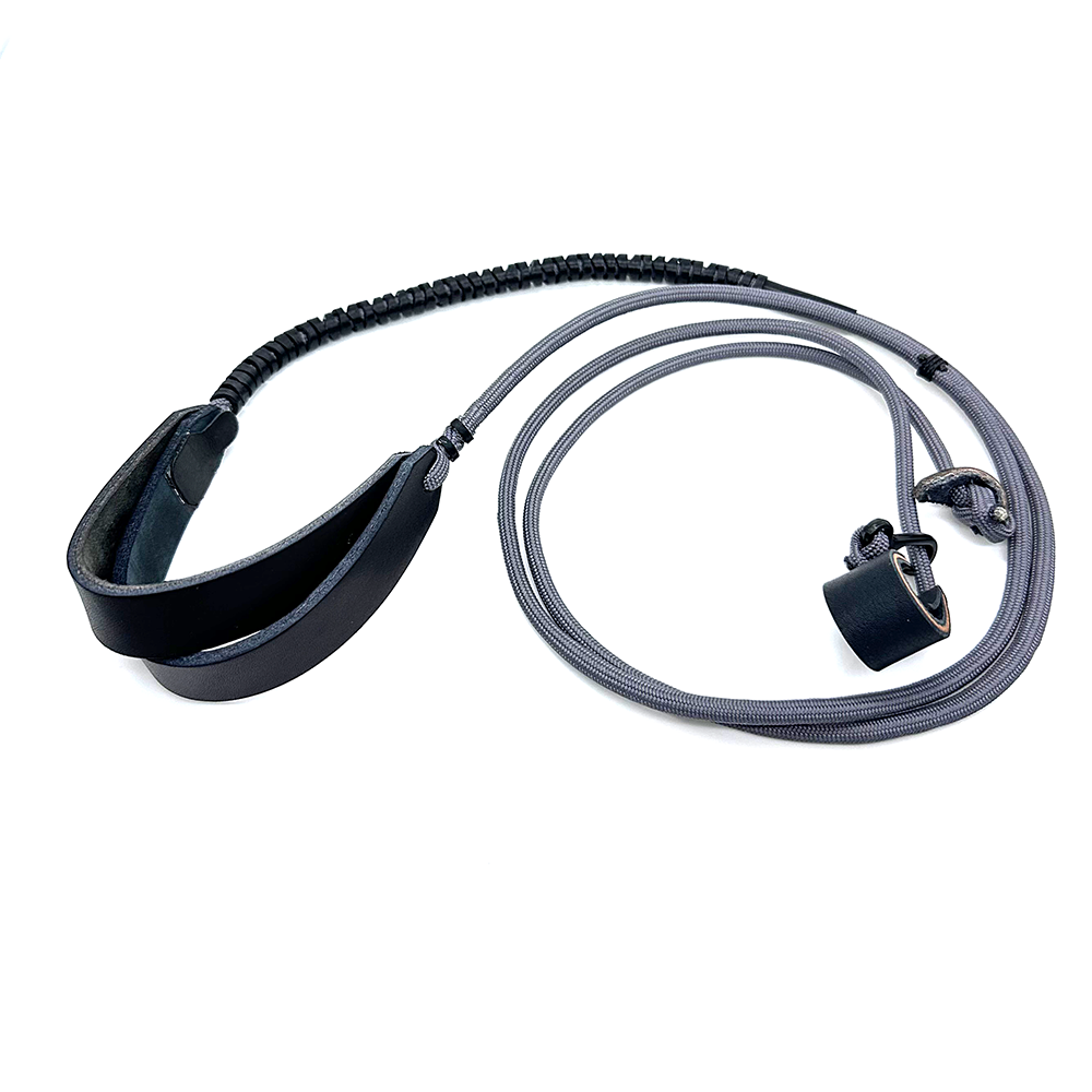Black leather, gray cords with black cord protection and accents. Galaxy black 3D printed Carry Tools (Reel, Little Pan) and Training Ball are included with each sling.
